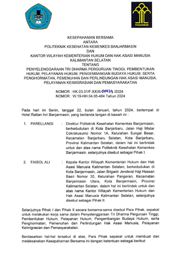 KESEPAHAMAN BERSAMA ANTARA POLITEKNIK KESEHATAN KEMENKES BANJARMASIN DAN KANTOR WILAYAH KEMENKUMHAM KALSEL TENTANG PENYELENGGARAAN TRI DHARMA PERGURUAN TINGGI, PEMBENTUKAN PELAYANAN HUKUM, PENGHORMATAN, PEMAJUAN DAN PEMENUHAN HAK ASASI MANUSIA, PELAYANAN