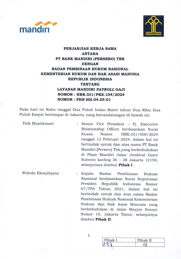 PERJANJIAN KERJA SAMA ANTARA PT. BANK MANDIRI (PERSERO) TBK DENGAN BADAN PEMBINAAN HUKUM NASIONAL KEMENTERIAN HUKUM DAN HAM TENTANG LAYANAN MANDIRI PAYROLL GAJI